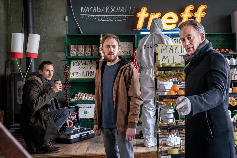 Moritz Brenner (Johannes Hendrik Langer, l.) und Jan Maybach (Marco Girnth, r.) sind gerade dabei, mit ihren Ermittlungen zu dem Mord im "Nachbarschaftstreff" zu beginnen, als plötzlich Simon Koschanowsky (Tino Mewes, M.) hereinplatzt. Jan bittet ihn, den Tatort zu verlassen.