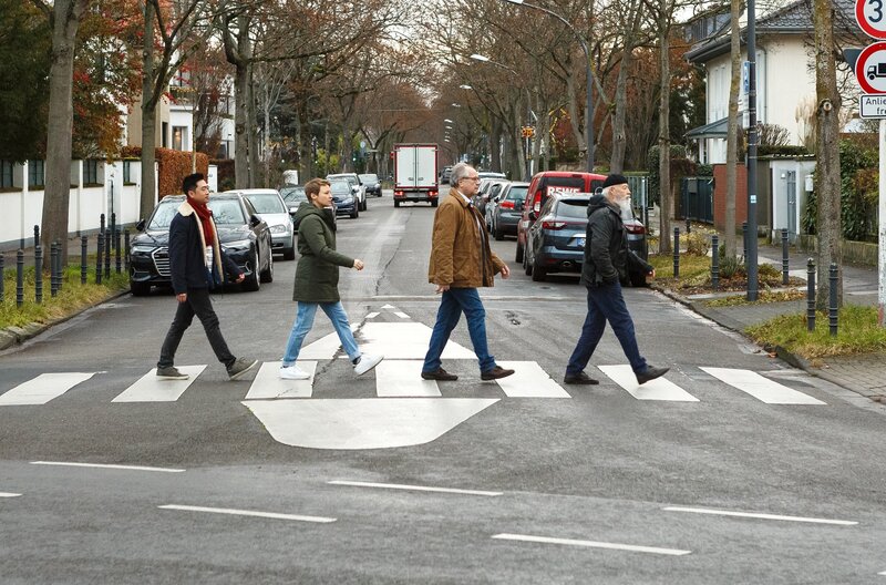• Hui Ko (Aaron Le, l.), Vicky Adam (Katja Danowski, 2.v.l.), Klaus Schmitz (Hartmut Volle, 2.v.r.) und Reinhard Bielefelder (Bill Mockridge, r.) überqueren den Zebrasteifen wie die 'Beatles'.