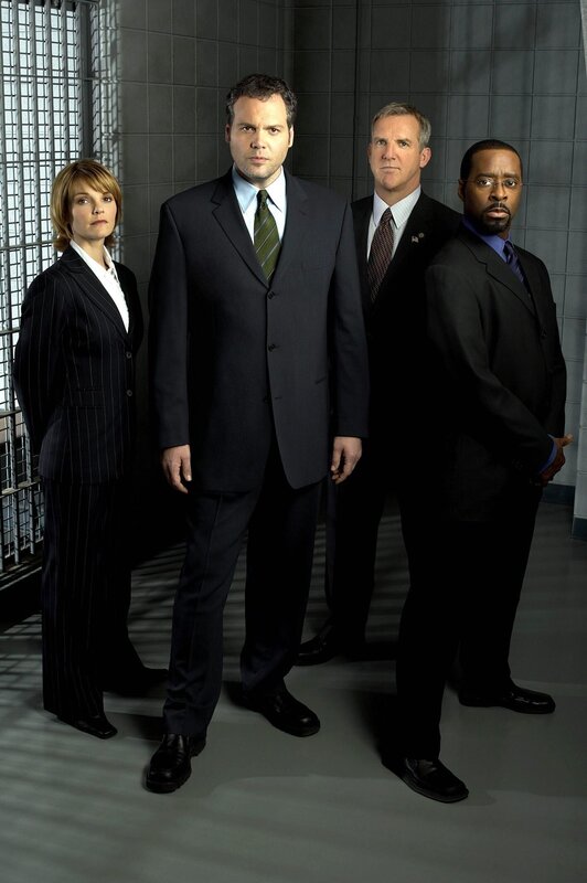 Von links: Detective Eames (Kathryn Erbe), Detective Goren (Vincent D'Onofrio), Captain Deakins (Jamey Sheridan) und Ron Carver (Courtney B. Vance) ermitteln in einem Mordfall.
