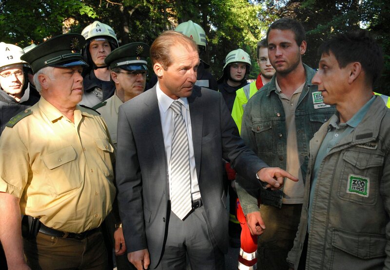 Zoodirektor Dr. Fährmann bespricht mit Cheftierpfleger Conny und dem Einsatzleiter souverän das weitere Vorgehen zur Evakuierung des Zoos. Alle Besucher und alle Zootiere müssen in Sicherheit gebracht werden.
