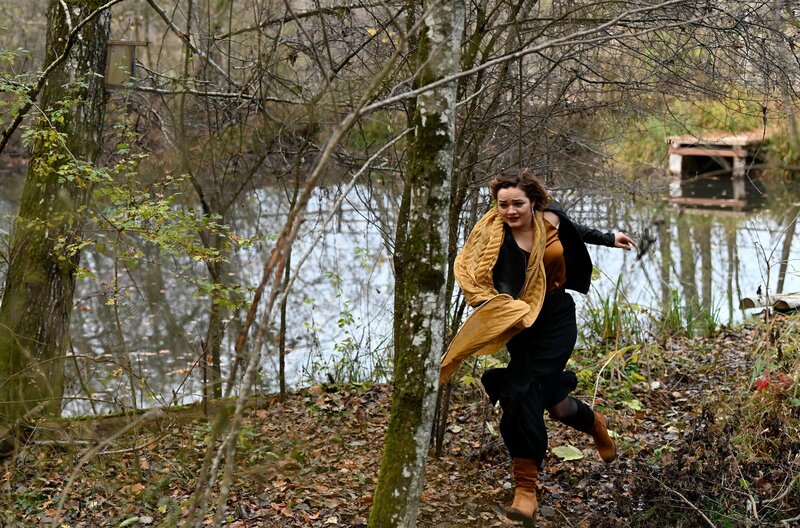 • Die Hausmeisterin des Schießplatzes Karen Moll (Lucy Wirth, h.r.) hat sich im Wald verschanzt. Julia Demmler (Wendy Güntensperger, h.l.) und Nele Fehrenbach (Floriane Daniel, r.) versuchen zu deeskalieren.