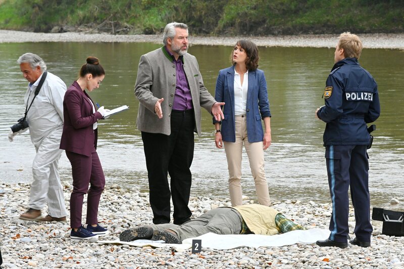 Pathologin Atay (Sevda Polat, 2.v.l.) erklärt den Kommissaren Stadler (Dieter Fischer, M.) und Andresen (Sophie Melbinger, 2.v.r.) sowie Polizeihauptmeister Mohr (Max Müller, r.), dass der Tote nicht ertrunken, sondern ermordet worden ist.