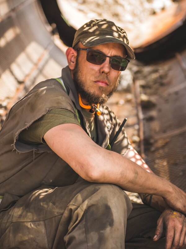 • Kevin in a crouching pose inside a piece of equipment.