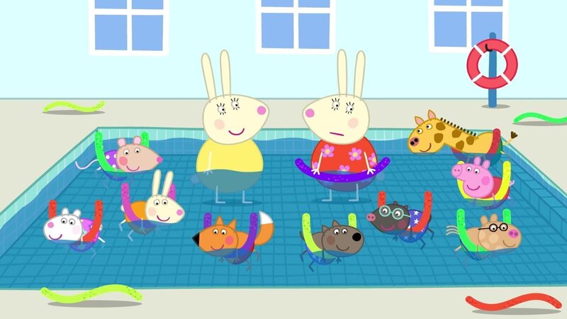 Frau Mümmel gibt Peppa und ihren Freundinnen und Freunden Schwimmunterricht.