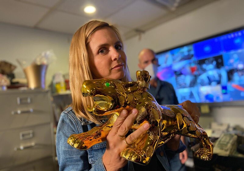 Mariana van Zeller in Allure's office holding a golden tiger statue.