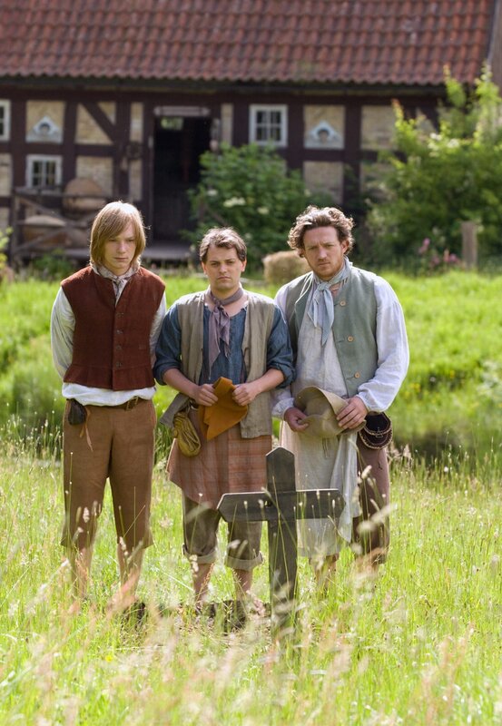 ARD/NDR DER GESTIEFELTE KATER, am Sonntag (16.10.11) um 10:03 Uhr im ERSTEN. v.l.: Die drei jungen Müller (Josef Heynert, Stefan Haschke, Jakob Matschenz) trauern um ihren Vater.