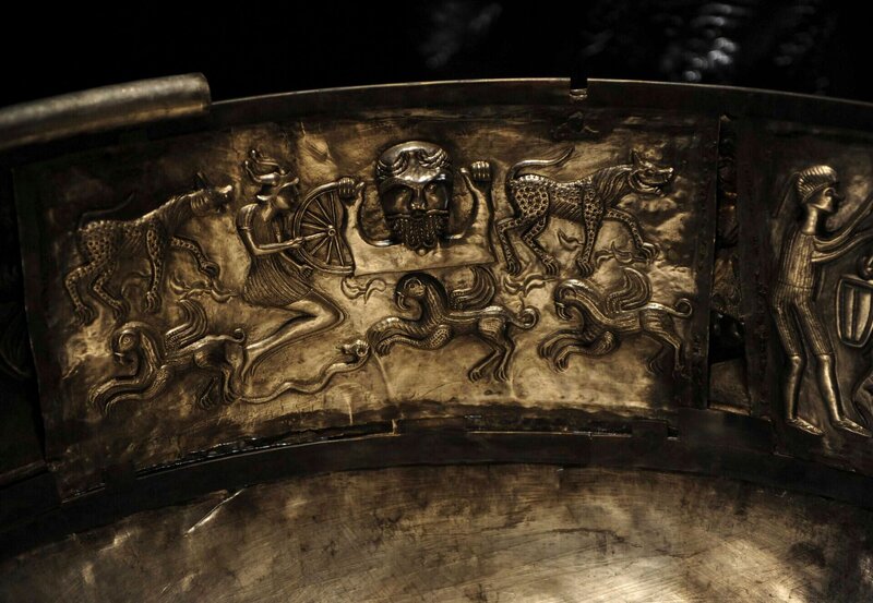 The Gundestrup cauldron. Decorated silver vessel, thought to date between 200 BC and 300 AD, placing it within the late La Te_ne period or early Roman Iron Age. Gundestrup in the Aars parish of Himmerland, Denmark. Scene showing the bust of a bearded god who holds a broken wheel in his righ hand, sometimes identified with the Celtic thunder god Taranos. The wheel is supported by a smaller figure with a horned helmet depicted in a jumping stance. Below the group is a single ram-horned serpent, three griffins and a pair leopards. National Museum of Denmark.