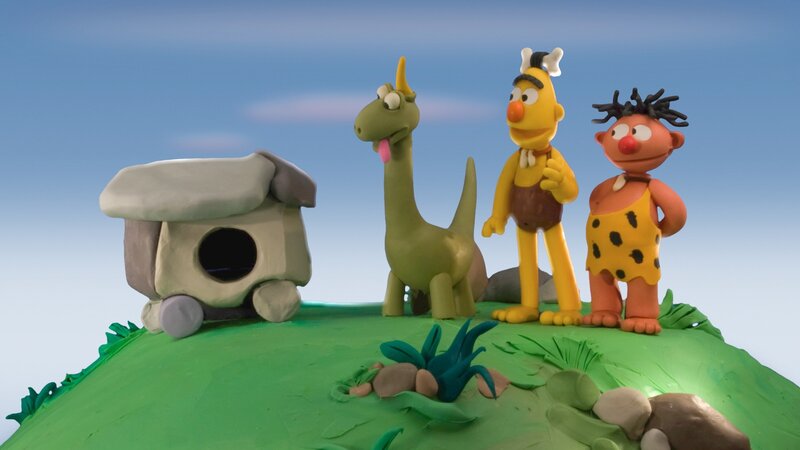 Ernie und Bert sind Höhlenmenschen und wollen für ihren Hausdino Spot eine Hütte oben auf einem Hügel bauen. Leider rollen die runden Steine immer wieder den Berg hinunter. Doch dann kommen die beiden auf die Idee, das rollende Steine eigentlich ganz praktisch sein können...