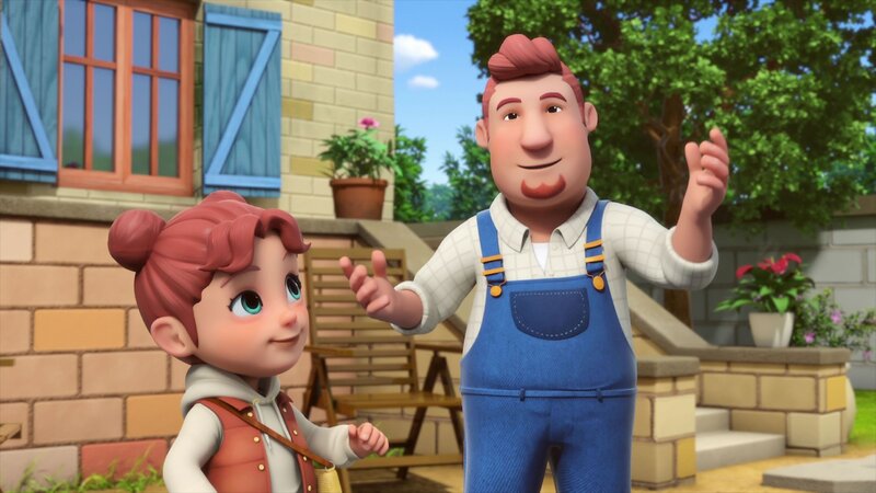 Sandrine (mi.) bestellt bei den Super Wings ein Paket mit einem Trüffeldetektor zu sich in die Dordogne nach Frankreich. Sie und ihr junges Schwein Snouty (re.) wollen im Wald zum ersten Mal Trüffel suchen gehen.