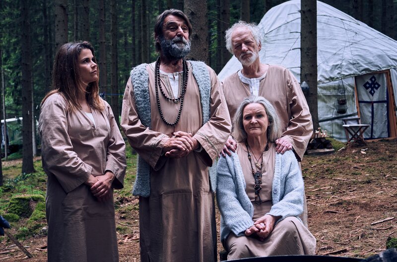 Marie Gabler (Katharina Wackernagel, l.) mit Katzenbart (Wolfgang Rüter, 2.v.l.) und ihren Eltern Uschi (Petra Welteroth, v.r.) und Rainer (Falk Rockstroh, h.r.). Sie hat sich in der Hippie-Community gut geschlagen und ist der Lösung des Mordfalles schon deutlich näher gekommen.