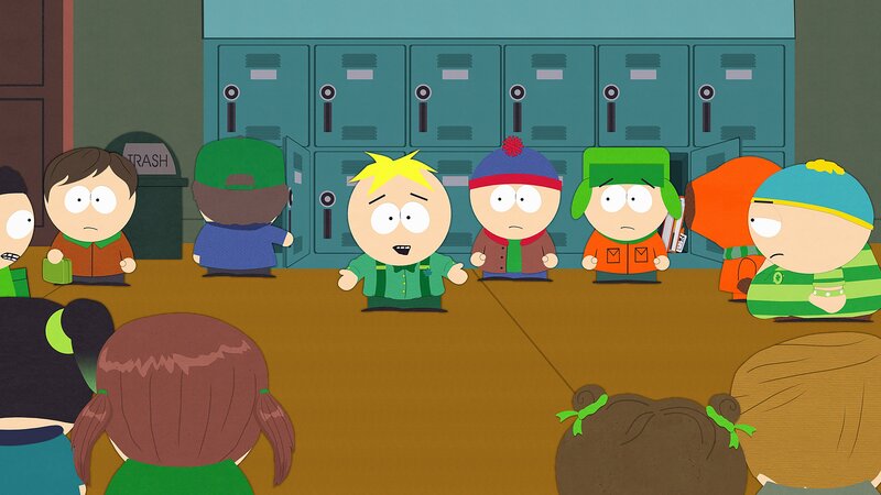 Hinter: Butters (4.v.l.), Stan (4.v.r.), Kyle (3.v.r.), Kenny (2.v.r.), Eric (r.)