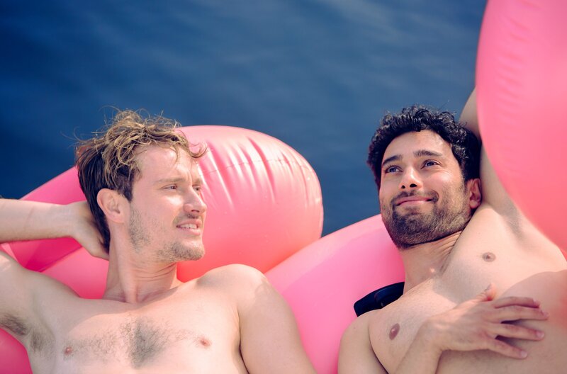 Damit hat er nicht gerechnet: Levo (Arash Marandi, li.) trifft am See auf seinen Ex-Freund Tom (Mads Hjulmand, 2. v. re.).