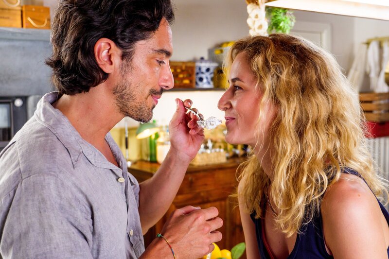 Nell (Pia Micaela Barucki, r.) will am Gardasee ihren Fluglehrerinnenschein machen. Davon will sie sich nicht ablenken lassen - weder von ihrem Fluglehrer Lukas noch von Simone (Stefano Bernardin, l.), auf dessen Grundstück sie mangels besserer Alternativen ihren Campingbus parkt. Simone, seine Mutter (Daniela Ziegler, 2.v.l.) und seine Tochter Viola (Samirah Breuer, 2.v.r.) nehmen Nell mit offenen Armen auf.