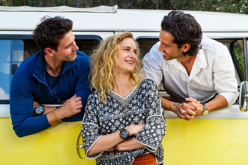 Nell (Pia Micaela Barucki, M.) hat alle Zelte in Deutschland abgebrochen, um am Gardasee ihren Traum zu verwirklichen und Gleitschirmlehrerin zu werden. Lukas (Joshua Grothe, l.) und Simone (Stefano Bernardin, r.) sind involviert.