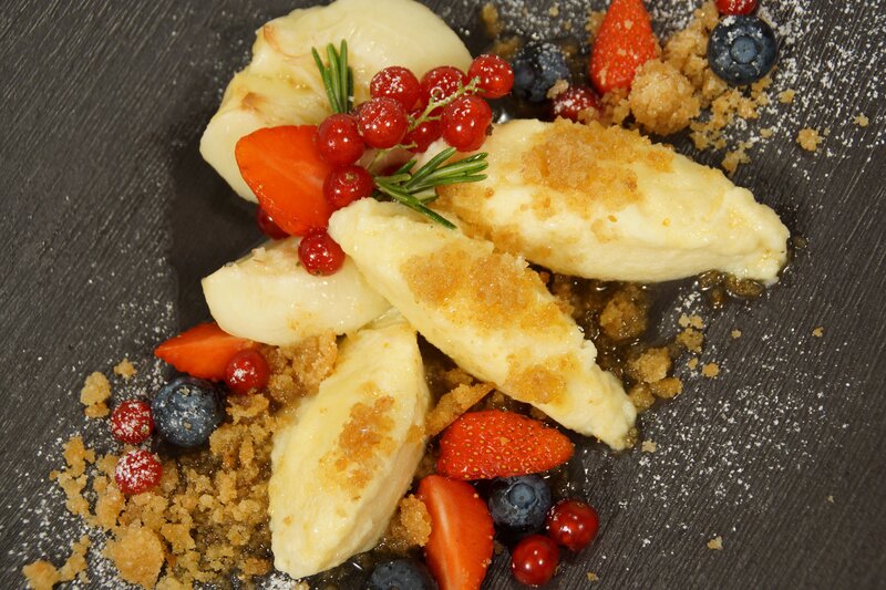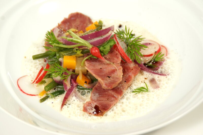 Gesurte Schweinsbackerl mit Bohnensalat / Sellerieschnitzerl mit Radicchio-Marmelade / Topfennockerl mit Pfirsich-Rosmarin-Kompott