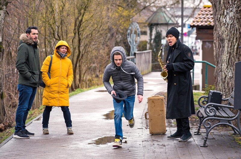 • Der Saxophonist Simon Pfister (Florian Clydem, r.) wird wiederholt von Kevin Müller (Eric Evers, 2.v.r. mit Kompars:innen, l.) beklaut. Ist das ein Versuch, ihn am Spielen zu hindern?