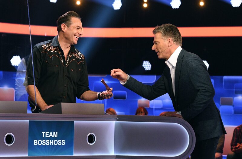 Moderator Jörg Pilawa (r.) mit dem Kandidaten Sascha Vollmer (l.), Musiker der Band "Bosshoss".