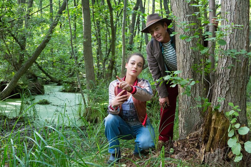 Zum Glück hat Keks das Handy von Leyla (Gülseren Erkut, r.) gefunden! Wird sie nun mit ihren Videos und der Hilfe von Fritz (Guido Hammesfahr, l.) herausfinden, ob es im Moor Geister gibt?