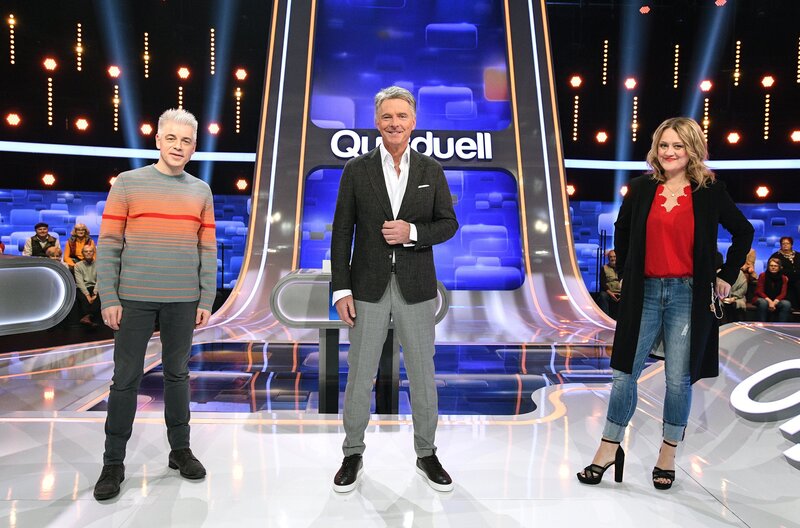 Moderator Jörg Pilawa (M.) mit den Kandidat:innen des Teams "Stand-up": Den Comedians Michael Mittermeier (l.) und Lisa Feller (r.).