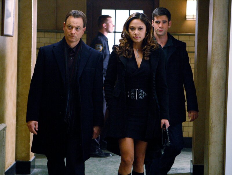 "CSI NY", "Überrollt." Nachdem in einer Gasse ein ehemaliger Junkie tot aufgefunden wird, deutet alles auf ein äußerst brutales Verbrechen hin: Der Mann wurde offensichtlich von einem Auto überrollt und danach in Brand gesteckt. Zudem findet sich eine Überdosis Heroin im Blut des Opfers. Als das CSI-Team jedoch erfährt, dass hohe Versicherungssummen im Spiel sind und erschreckende Ähnlichkeiten zu einem früheren Fall auftauchen, erscheint der Fall plötzlich in einem ganz anderen Licht.Im Bild (v.li.): Gary Sinise (Det. Mac Taylor), Vanessa Minnillo (Grace Chandler), Eddie Cahill (Det. Don Flack).