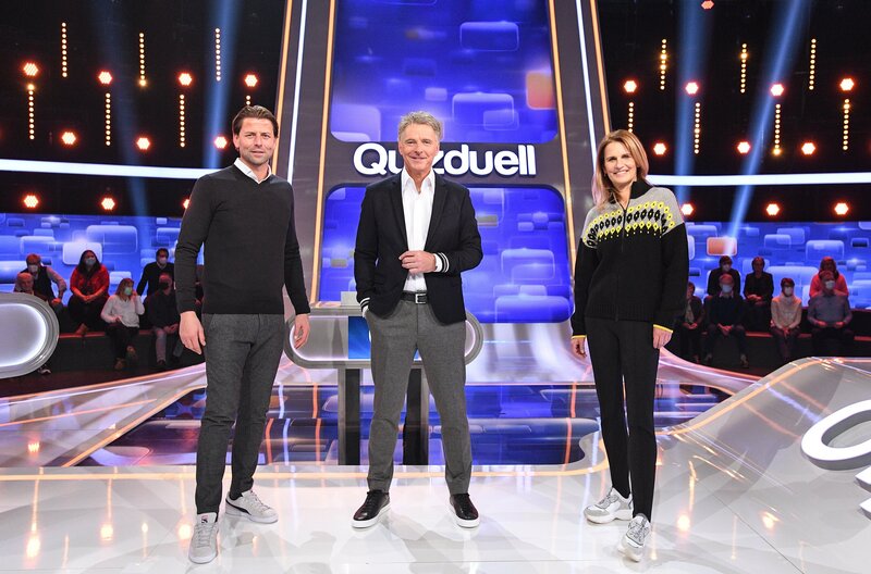 Die Kandidaten des Teams "Anstoß": Der Ex-Profifußballer Roman Weidenfeller und die Sportjournalistin und Moderatorin Katrin Müller-Hohenstein treten zum Duell an. Um zu gewinnen, müssen sie die superschlauen "Quizduell"-Profis schlagen.