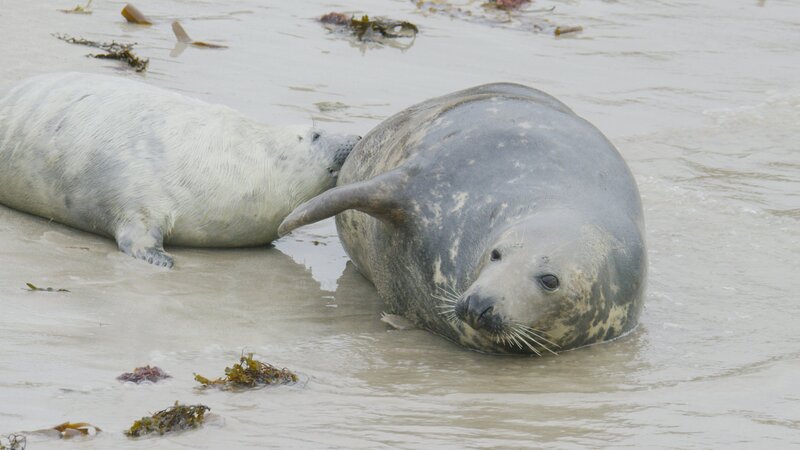 • Diese junge Kegelrobbe auf den Orkney-Inseln genießt die fettreiche Milch seiner Mutter.