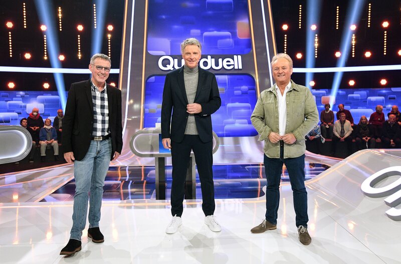 Die Kandidaten des Teams "Hitparade": Die Moderatoren Viktor Worms und Uwe Hübner stellen sich bei Jörg Pilawa der Herausforderung. Um zu gewinnen, müssen sie die superschlauen "Quizduell"-Profis schlagen.