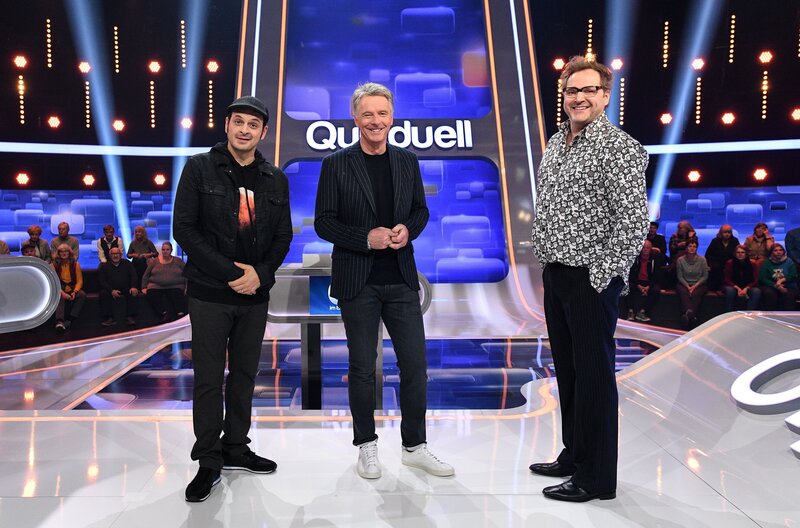 Moderator Jörg Pilawa (M.) mit den Kandidaten des Teams "Gags": Den Comedians Kaya Yanar (l.) und Paul Panzer (r.).