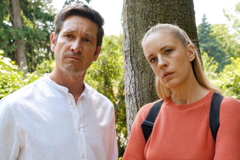 • Bezirksinspektor Klaus Lechner (Andreas Kiendl) und Gruppeninspektorin Penny Lanz (Lilian Klebow) versetzen sich in den möglichen Tathergang, wie der Verdächtige Drassl seine Freundin Tamara Jansen im Park getötet haben kann.