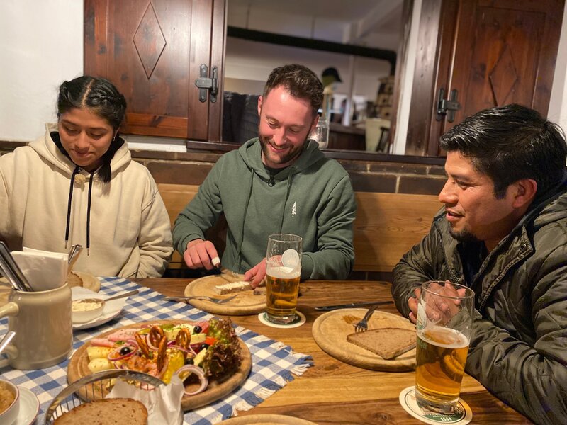 • Kaffeeröster Bernhard zeigt seinen mexikanischen Tauscharbeitern, wie eine echt bayerische Brotzeit aussieht.