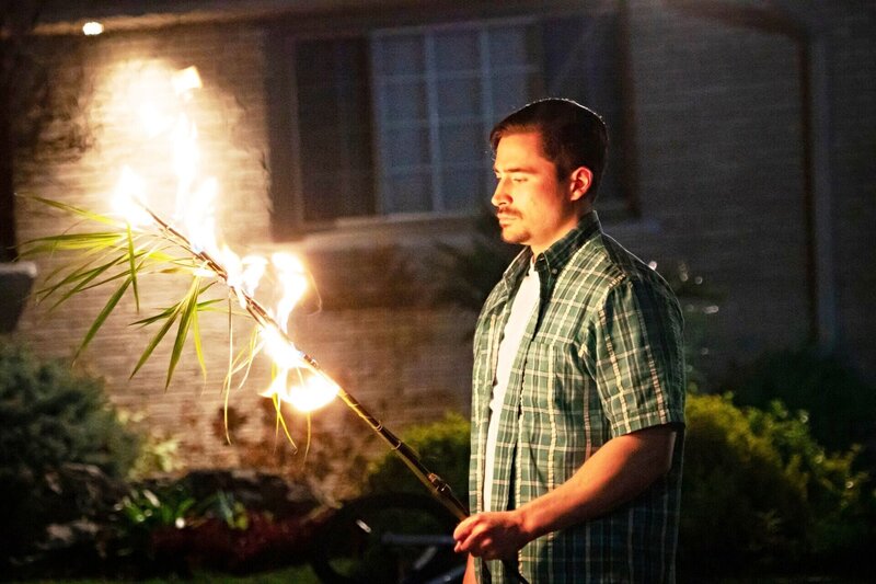 Ein Mann schaut auf eine brennende Pflanze in seiner Hand