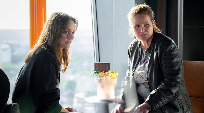 Charly (Mathilde Bundschuh, l.) und Gudrun (Katrin Pollitt, r.) sind gemeinsam im Einsatz und beschatten die Zwillingsbrüder Neuhoff.
