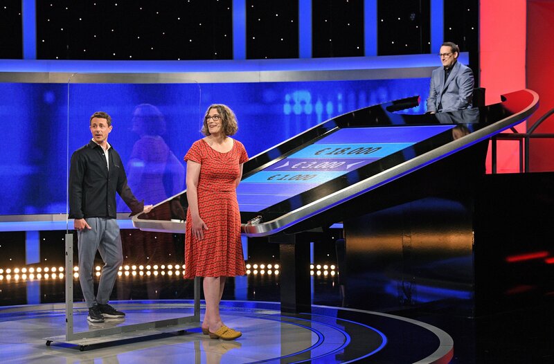 • Moderator Alexander Bommes mit der Kandidatin Iris Braecklein und dem Jaeger Dr. Manuel Hobiger.
