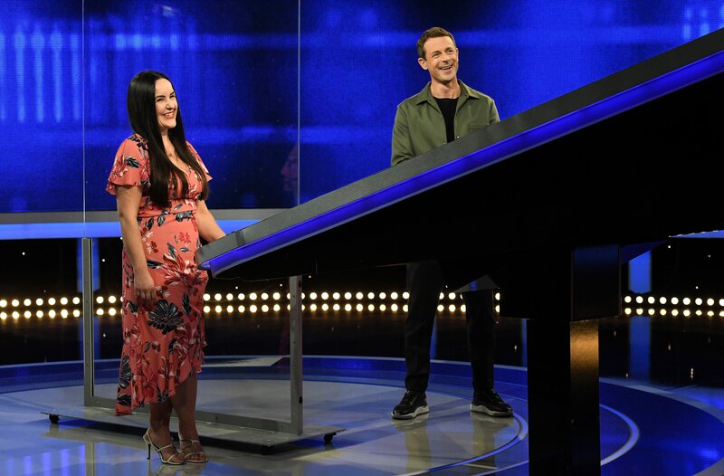 Moderator Alexander Bommes mit der Kandidatin Luisa Greif und dem Jäger: Dr. Manuel Hobiger.