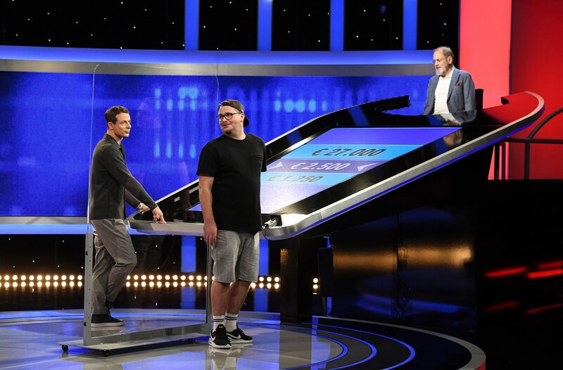 Moderator Alexander Bommes (l.) mit dem Kandidaten Simon Tollrian am Panel (M.) und Jaeger Klaus Otto Nagorsnik (r.).Bild: © ARD/Uwe Ernst