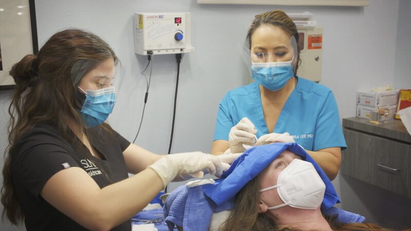 Dr. Lee uses liquid nitrogen on Edith Brown’s black spots.