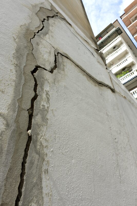 Severe cracks in a concrete residential building, caused by subsidence. Southeast Asia.