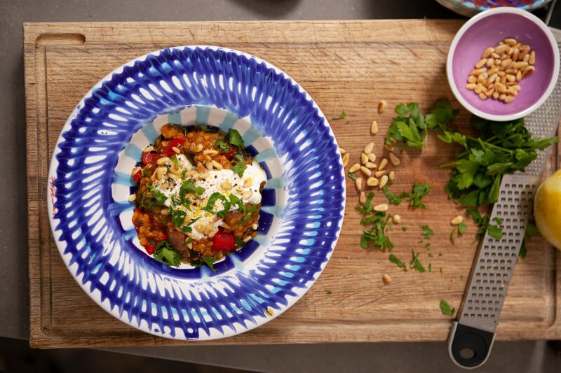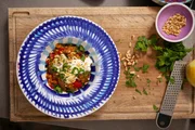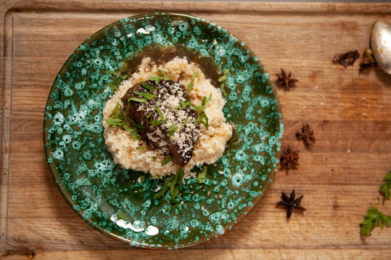 Ob bayerische Klassiker oder Speisen aus der ganzen Welt: Die Gastronomin Veronika Lutz liebt es, in der Küche ihres Cafés am Simssee kulinarische Kreationen zu erfinden. Diesmal schmort sie in einer Tajine ein Gericht, zu dem sie ihr marokkanischer Freund Tarik El Horchi inspirierte: Ochsenbacken mit Graupen-Risotto - und als vegetarische Variante bereitet sie einen Linsen-Auberginentopf zu.