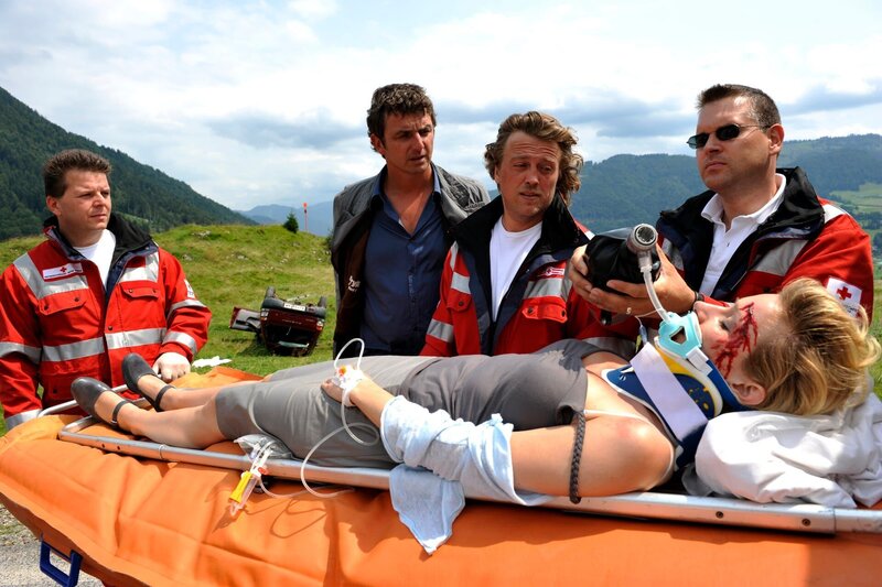 Martin (Hans Sigl, 2.v.l.) ist hilflos, als die schwangere Susanne (Natalie O’Hara, vorne) nach einem Umfall ums Überleben kämpft.