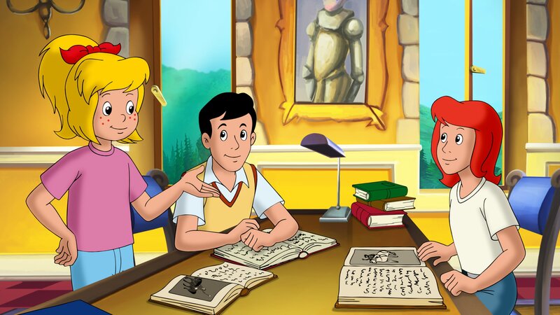 • Bibi (l.), Tina (r.) und Alex (M.) recherchieren, ob es Gründe gibt, wieso Alex auf einem Schimmel reiten muss.