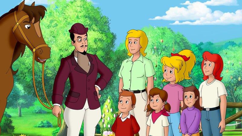 Frau Martin (3.v.l.), Bibi (3.v.r.), Tina (r.) und die Ferienkindern überzeugen Falko (l.) von weiteren Neuerungen an Ostern, den Ostermonstern.