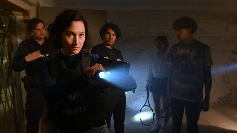 Können Pauline Hobrecht (Agnes Decker, 2.v.l.) und Samir Amari (Skandar Amini, M.) es mit ihrem Kollegen (Komparse, l.) schaffen, die Entführungsopfer Romy Lubitz (Greta Bohacek, 2.v.r.) und Julian Schmitt (Marven Gabriel Suarez-Brinkert, r.) rechtzeitig zu finden?