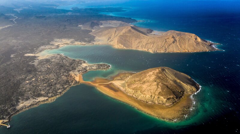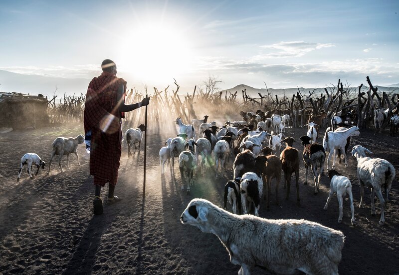 Kamel mit gefiederten Begleitern im abendlichen Wadi Rum-Tal in Jordanien. Das Wadi Rum-Schutzgebiet in Jordanien gehört zum Weltnaturerbe der UNESCO. Luftaufnahme über dem Golf von Tadjoura am nördlichen Rand des Horns von Afrika. Die Rub al-Chali, die größte Sandwüste der Erde, erstreckt sich über fast ein Drittel der arabischen Halbwüste in deren Süden. Ein Massai mit Schaf- und Ziegenherde in Tansania.