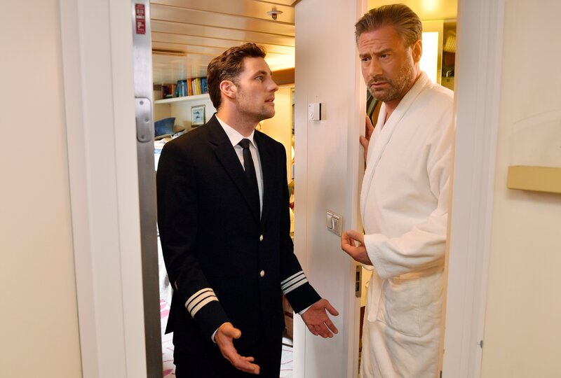Da Staff-Kapitän Martin Grimm (Daniel Morgenroth, M.) keinen Stargast für den Galaabend gefunden hat, greift er selbst zur Ukulele. Unterstützung erhält er von Tobias (Sasha, r.) und Kapitän Max Parger (Florian Silbereisen, r.).