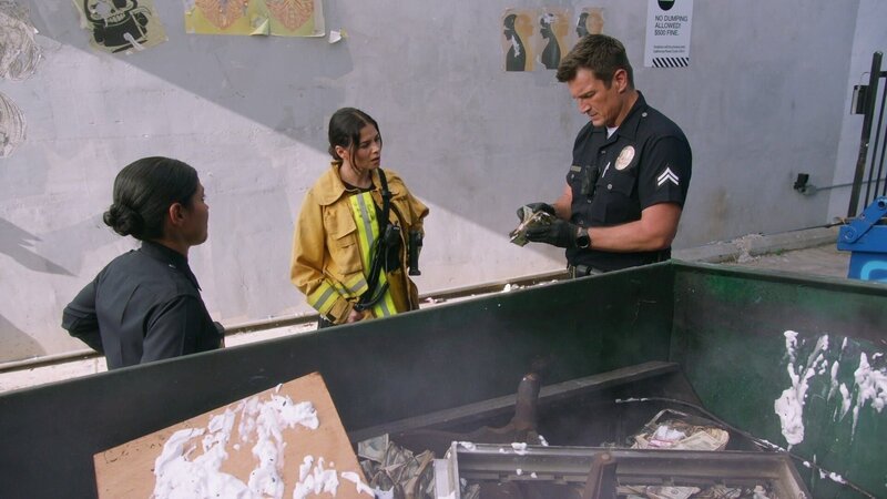 Officer John Nolan (Nathan Fillion, r.) und seine Partnerin, die Feuerwehrfrau Bailey Nune (Jenna Dewan, M.), stehen zusammen mit Officer Celina Juarez (Lisseth Chavez, l.) vor einem großen Rätsel: Warum verbrennt jemand einen Haufen Geld?