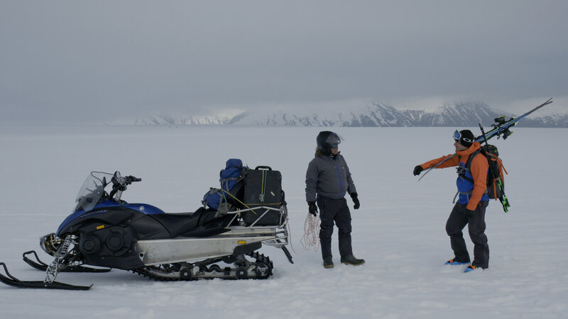 • Zwei Personen unterhalten sich in der Nähe von Schneemobilen