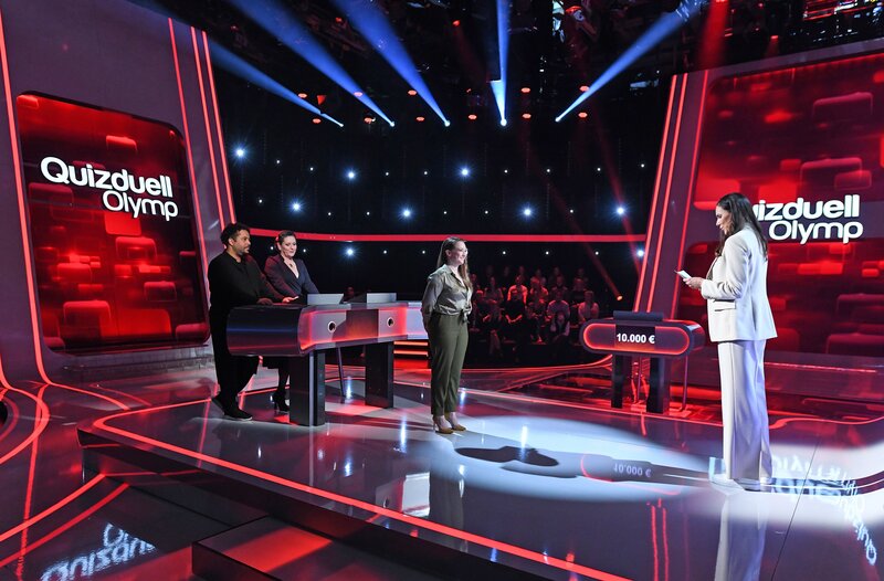 Moderatorin Esther Sedlaczek (r.) mit den Kandidat:innen des Teams "Musik": Adel Tawil (l.) und Anna R. (2.v.l.), sowie Quiz-Königin Marie-Louise Finck (M.).