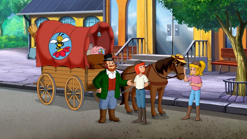 • Bibi (r.) und Tina (M.) versprechen Hannes auf Paule (l.) aufzupassen! Mit ihm wollen sie zum Trödelmarkt-Verkauf zugunsten der Bienenfreunde.
