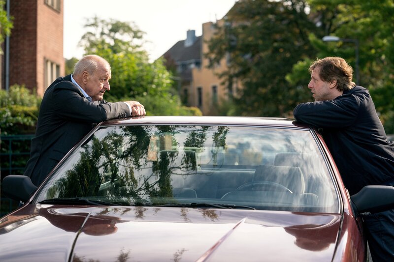 • Ekki (Oliver Korittke, r.) möchte die Schwester des Verunglückten besuchen und versuchen, eine Welle von Schadensersatzklagen von sich abzuwenden. Wilsberg (Leonard Lansink, l.) versucht, ihn davon abzuhalten.