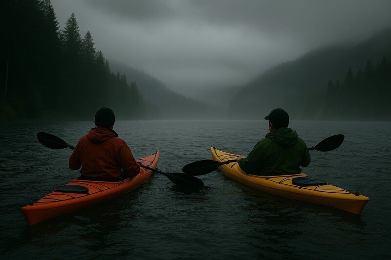 Am frühen Morgen zieht Nebel über das ruhige Wasser im Bundesstaat Washington, während eine Gruppe von Kajakfahrern lautlos durch den Dunst gleitet. Mächtige immergrüne Bäume säumen das ferne Ufer, ihre Spiegelbilder tanzen auf dem glatten See. Die Atmosphäre ist friedlich und zugleich geheimnisvoll – sanftes Licht bricht durch den Nebel, und das einzige Geräusch ist das leise Plätschern der Paddel.